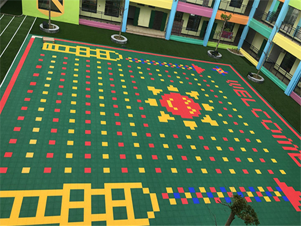 幼兒園懸浮地板在安裝的過程當中不需要使用膠水粘結,直接拼裝即可,且只需用清水沖洗即可,污水會隨著地板底部的排水口排出,不會形成淤積,清洗同時不會影響使用,打理起來十分方便。